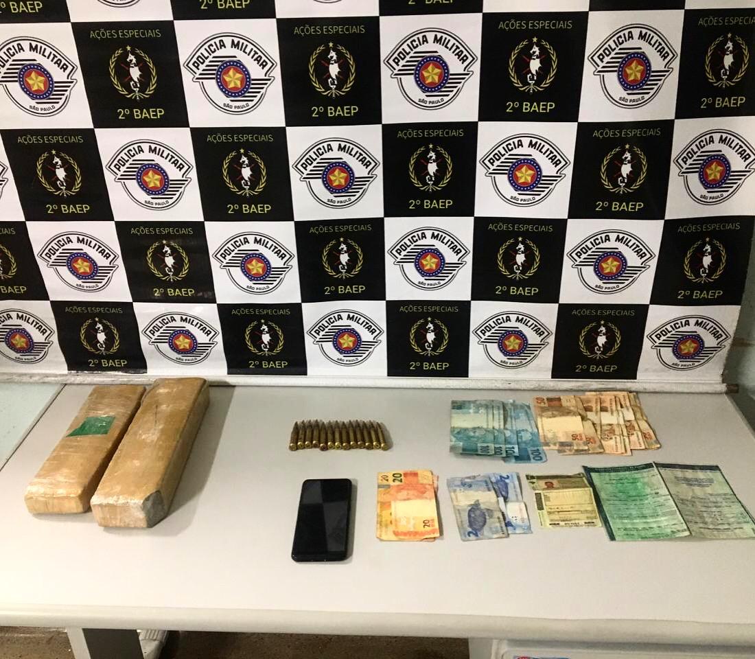 PM apreendeu 1,8 kg de maconha e 13 munições no porta-malas do carro que era conduzido pelo vigilante