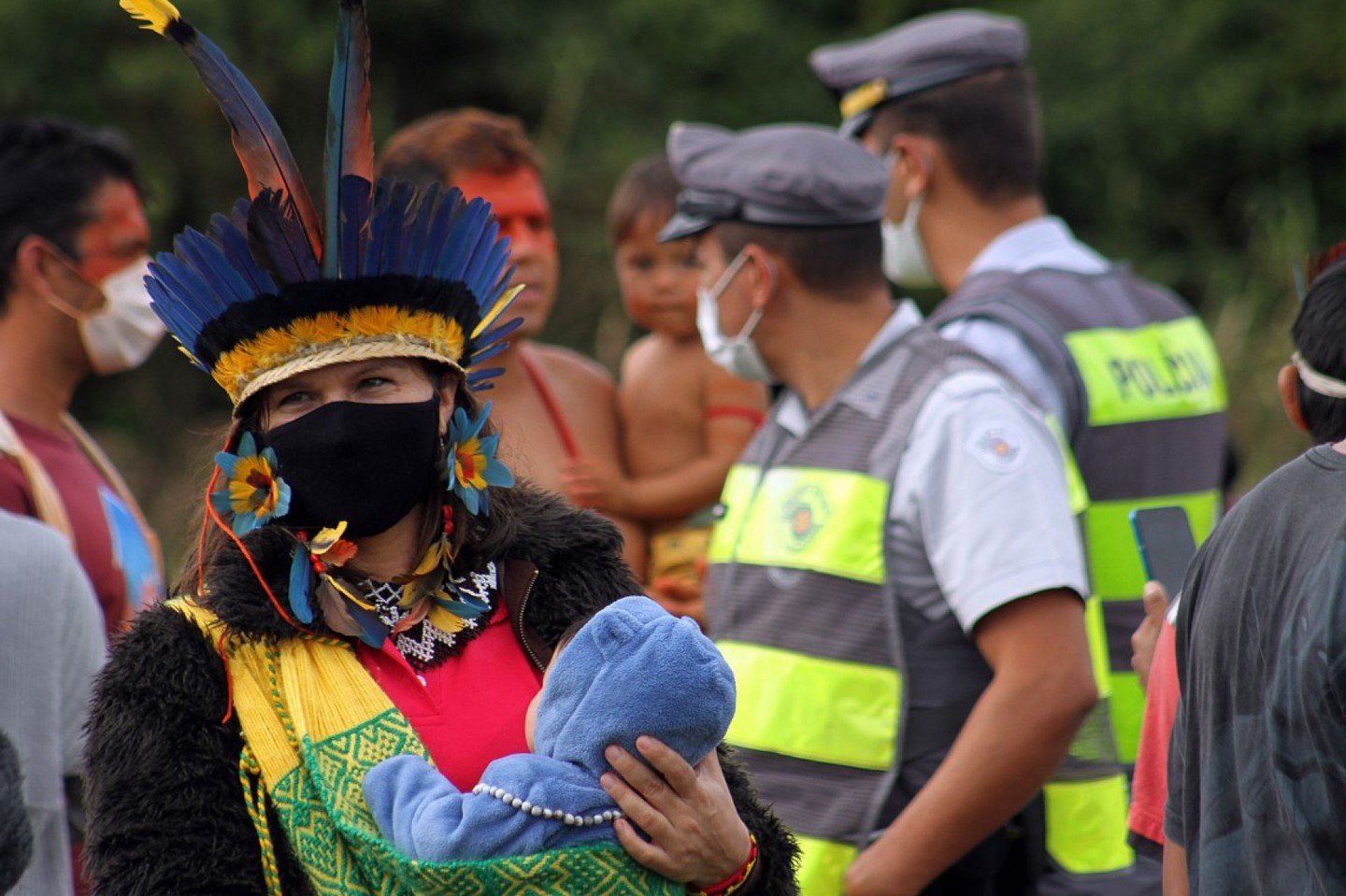 A líder da aldeia Catarina Delfina dos Santos, da aldeia Tapirema, na Terra Indígena Piaçaguera, esclarece que o protesto foi realizado para apoiar os indígenas que estão lutando, em Brasília, para que o projeto de lei 490 e o marco temporal não sejam aprovados.
